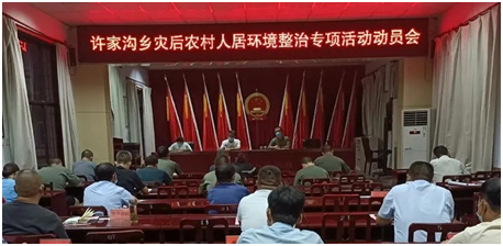 许家沟乡连夜召开灾后人居环境整治专项活动动员会,会上宣读许家沟乡灾后农村人居环境专项整治活动月方案及奖惩办法。会后,辖区20个村迅速行动,高标准规划、高质量建设、高效率推进恢复重建,创新创造推进环境整治,将灾后重建和人居环境整治两结合、两推进,因地制宜、因村施策,结合实际创新思路举措,全方位、精细化推进整治。出动大型器械整修干道河沟、修复桥梁堤岸,解除安全隐患;村干部指挥使用柴油抽水泵,排出受灾田地内的积水;充分动员群众自救,引导群众积极参与环境整治的全过程,修复吃水管道、电线杆,以最快速度让农村环境恢复至洪水前水平;加速清除灾后垃圾、淤泥及其他重点公共场所废弃物,加快消杀,有效遏制病菌的传播。