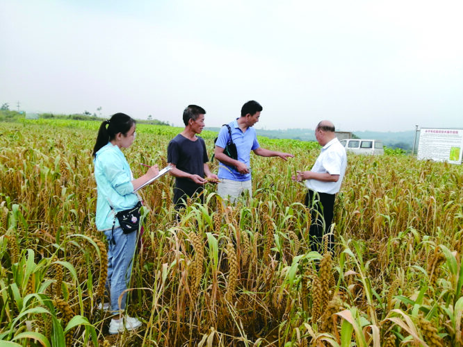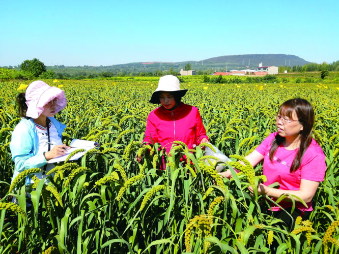 梁晶(左一)在给农户指导谷子种植技术。