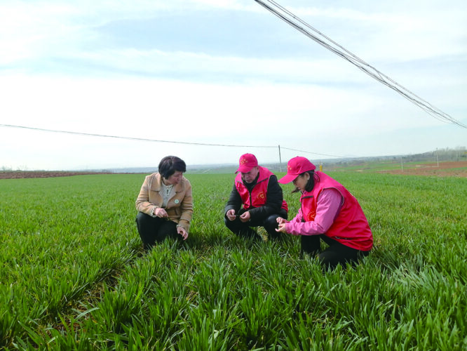 梁晶(右一)在给农户指导小麦田病虫害防治技术。(资料图片)