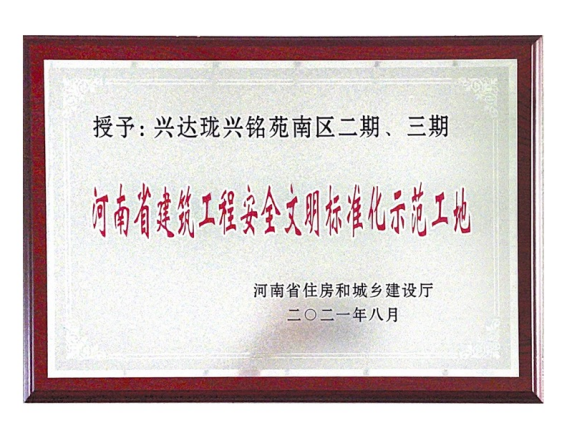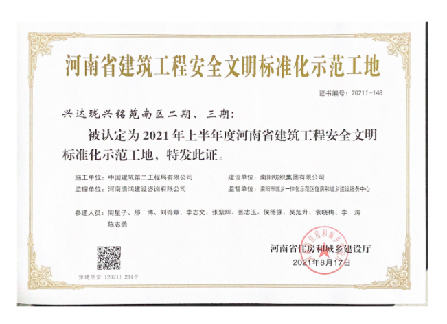 日前,中建二局中原分公司南阳兴达珑兴铭苑南区二期、三期项目被河南省住房和城乡建设厅授予2021年度上半年河南省建筑工程安全文明标准化示范工地。