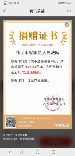 为弘扬中华民族传统美德,助力慈善事业发展, 9月8日,河南省商丘市梁园区人民法院积极组织干警开展“99公益日”爱心捐款活动。截止发稿共筹集善款 1870余元。捐款活动仍在继续中。