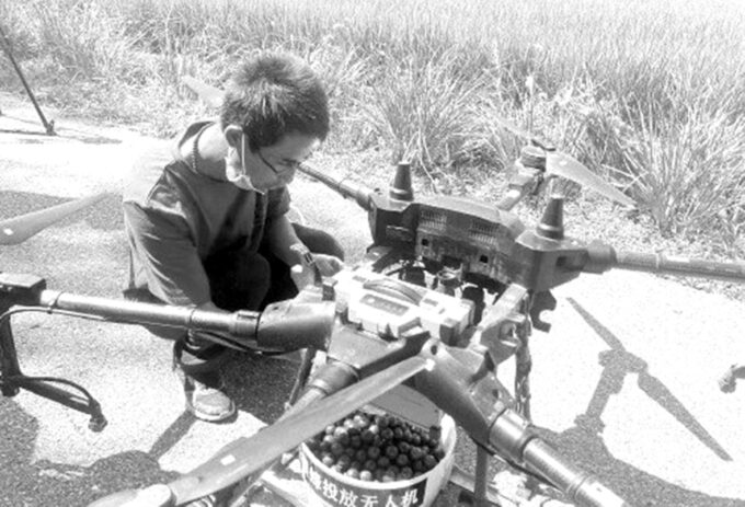 工作人员正在将稻螟赤眼蜂放入无人机播撒盒里。