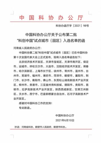5月28日-30日,两院院士大会、中国科协第十次全国代表大会召开,会上公布了第二批“科创中国”试点城市名单,鹤壁市成功入选。