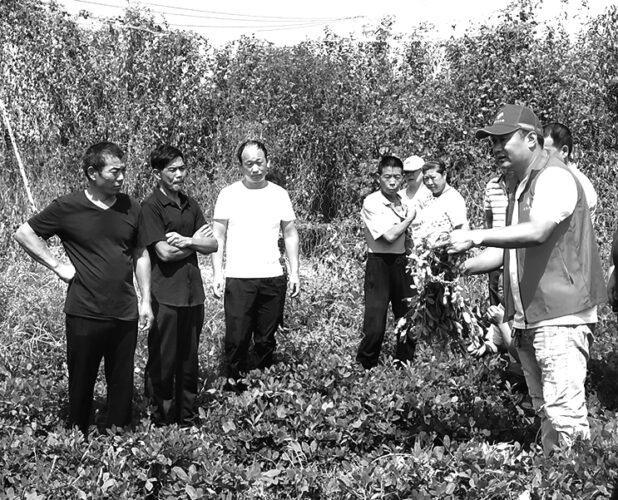 9月12日,中国农学会科技志愿者、平顶山市绿禾农业科技开发有限公司董事长郭亚培(右一)在汝河湾富硒生态园里,为长桥镇、堂街镇的50余名种植大户、致富带头人讲解富硒黑花生种植技术要领。在市、县有关部门协调下,中国农学会科技志愿服务平顶山功能元素农业分队于今年7月成立,旨在服务农业、立足农村、富裕农民,助力乡村振兴。当天,是该分队第一次组织田间志愿服务活动。