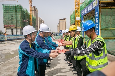 在“学党史”环节,通过“身临其境学党课”的方式讲述了“选址西柏坡,新中国从这里走来”,缅怀革命先辈,不忘革命初心。项目青年团朗诵诗歌《西柏坡精神颂》,展现项目青年员工积极向上、向党靠拢的精神风貌。在“悟思想”环节,项目管理人员上台宣誓,承诺在工作、生活中积极践行“西柏坡精神”,建设人民满意工程,造福沧州百姓。业主及项目管理人员在“抓重点、克难点、保节点,全面掀起大干新高潮”条幅上签字承诺。在“办实事”环节,项目经理向青年突击队授旗,提高项目青年员工责任担当意识,为项目各项工作开展提供强劲动力。项目党员干部、青年突击队队员与协力队伍人员及当地居民结对帮扶,并发放志愿服务卡,全力以赴帮助他们解决生活、工作中遇到的问题。在“开新局”环节,项目工程经理带领与会人员参观施工现场,介绍项目的工程概况、工程重难点,以及建设过程中的感人故事,让与会人员感受企业的综合实力以及建设人民满意工程的决心和信心。