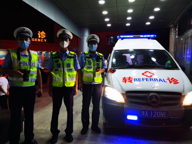 闪烁的警灯划破了黑黑的夜空,清脆的警笛提醒着前方车辆紧急让行。为了保障车队通行平安,执行任务的每一位民警辅警都瞪大了警惕的眼睛;为了最大程度减小对救护车内患儿的惊扰,负责开道的民警把警笛的声音调到了最小;为了争取更多的抢救时间,救护车的速度开到了120公里/时……