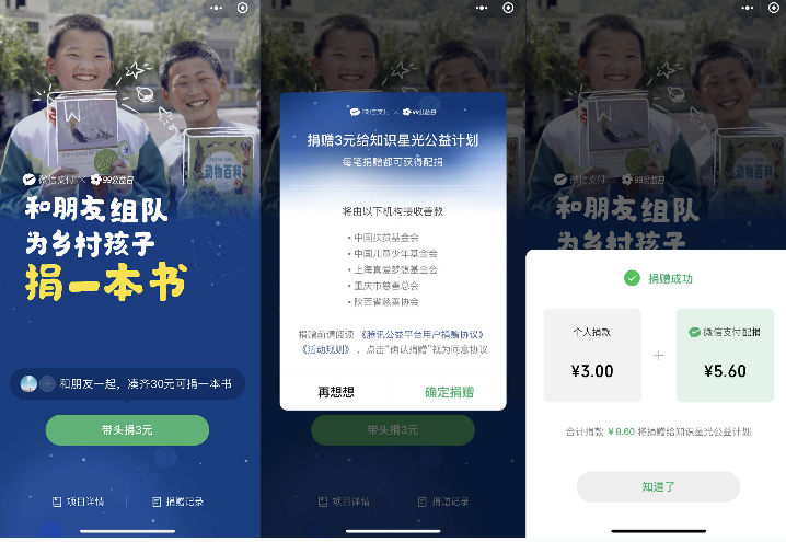 “微信支付一起捐”是今年腾讯99公益日的重要组成部分,作为“知识星光”公益计划的一部分,把“优质图书+阅读空间+阅读培训”一起带到乡村小学,覆盖中国云贵川等多个省市。截至2021年6月,“知识星光”公益计划已完成捐赠约30万册图书,建成99个图书馆,685个图书角,惠及177所学校。
