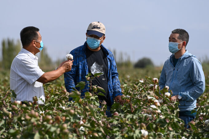9月16日,在新疆轮台县塔尔拉克乡“中国棉花”可持续发展项目示范田,棉花产业相关从业人员在查看棉花质量。