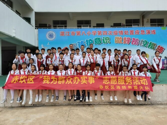 赤坎区消防救援大队给全校师生普及消防安全知识和演示遇到消防隐患时的应对措施,全面深入地推动师生安全教育工作,培养小学生遇到突发事件的应变能力,大力降低学生各类伤亡事故的发生率,提高了师生们火灾逃生自救能力,切实增强师生的安全防范意识,护卫祖国花朵健康茁壮成长。