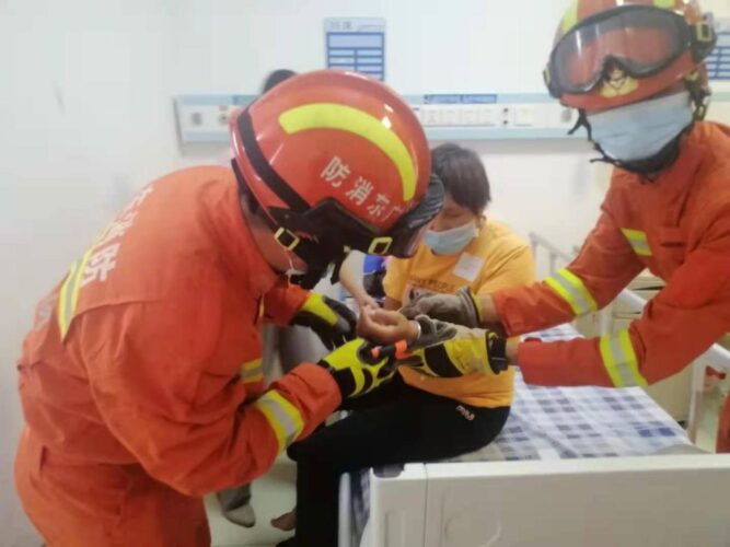 2021年6月1日上午,赤坎消防救援大队接到中心人民医院急诊病人手臂被手镯卡住而无法进行手术的突发警情。