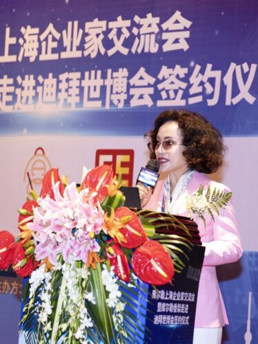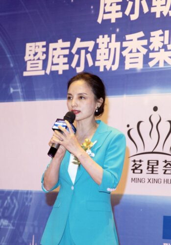 茗星荟创始人、青青恒美技术研究院院长黄小梅致词。她表示,库尔勒是久负盛名的“瓜果之乡”,香梨更有“世界梨后”美誉。库尔勒香梨成功走进迪拜世博会,香飘世界,必将带动库尔勒经济发展,为建设大美新疆添砖加瓦。