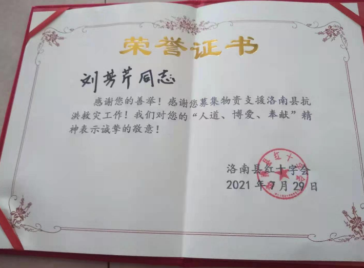 洛南县新联会副会长郭妮携全家第一时间为灾区捐赠物资