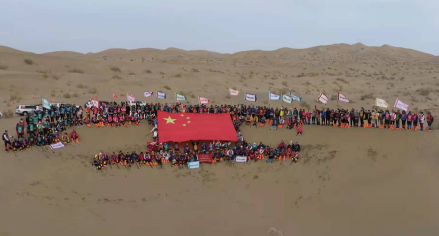 日前,在甘肃敦煌戈壁上由乐行中国举办的“重走玄奘西行路”戈壁徒步挑战赛中,300位来自全国各地的企业家高唱国歌,在嘹亮的歌声中,一面巨型国旗在大漠戈壁深处冉冉升起,致敬建党100周年。