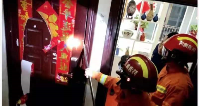 18时22分许,消防救援人员抵达现场。经了解屋内是一名两岁的小女孩,孩子妈妈趁着孩子睡觉下楼去拿快递,回来时门上的电子锁出了问题(密码、指纹试过以后无法打开),联系了开锁公司后也无法打开。现场,屋内的小孩已经醒来,在门外能听到孩子在里面的哭声,孩子妈妈心急如焚,担心小孩安危,不停的催促救援人员。确定了情况后救援人员立即使用撬杠、液压扩张钳对门夹缝进行破拆,18时31分成功将房门打开。指战员确认孩子安全后,规整器材返回救援站。