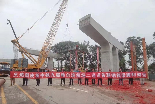 中铁九局四公司哈尔滨机场二通道迎宾路高架工程首联钢箱梁架设成功