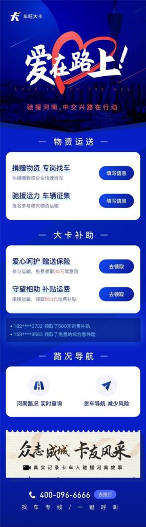 同期,在车旺大卡APP开设救灾与重建服务专区,为抢险救灾和灾后重建贡献力量。通过开通400-096-6666客服专线,“物资运送服务”“保险和运费补贴”“路况实时查询”等多种公益举措,为受灾司机提供服务,为驰援司机打通救灾通道,并为进出受灾地区的货运车辆和捐赠物资企业提供智能运力支持。