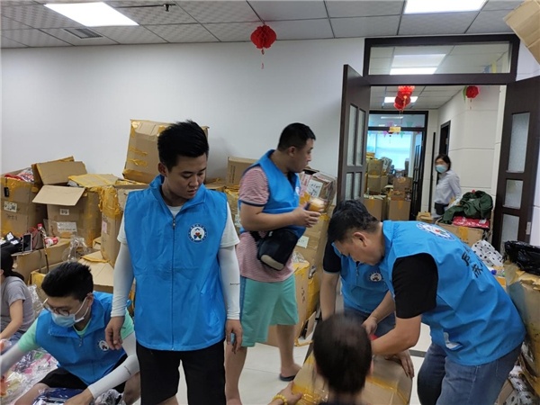 康臣益行社郑州分社社员们深入受灾一线,主动协助当地公益团队搬运救灾物资愈万件