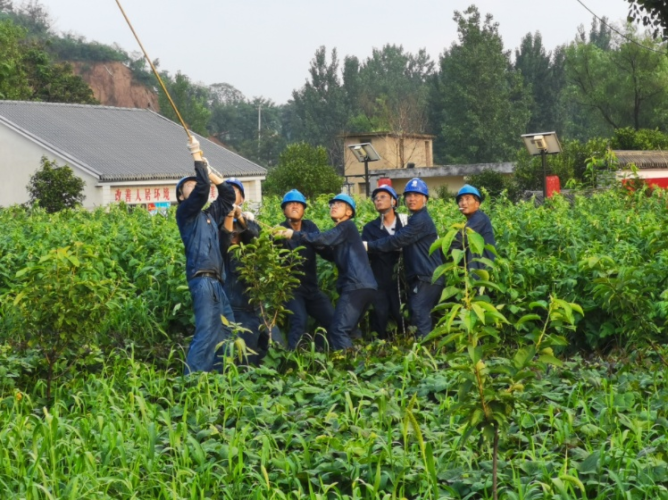 “不能让老百姓等,设备进不来,咱们就自己扛!”7月26日,河南省巩义市米河镇米北村满是杂草和泥浆的土地上,响起来整齐的呼号声,10名身穿蓝色工服的电力工人正用尽全力扯着手中的绳索,准备把前方数百公斤重的电线杆靠人力立起来。米河镇是巩义市受灾最严重的乡镇,国网宁东供电公司负责抢修的米镇线是此次受灾最为严重的线路,它承担着为米河镇及周边米北村等3个村庄负荷,2000户低压用户输送电能的任务。国网宁东供电公司第二批援豫抢险队在7月24日进驻巩义市米河镇后,顾不上休息,便立即赶往抢修现场。抢修队员克服了降雨、道路泥泞、气温炎热、地形复杂、灾后路基多处塌陷、吊车、挖机等器械无法进入的困难,硬是靠人力在48小时内完成了米镇线高压10千伏电杆正杆3处,紧急处理倒落房屋电杆2处,处理低压倒杆、断杆各1处,隔离故障点4处,校正耐张横担3处,更换10千伏线路130米等工作,于7月26日下午8时率先恢复了米北村前段800余户村民的供电任务。