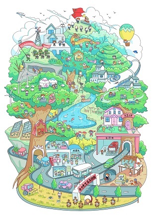 《乡村振兴赞歌图》是艺术玩具产业第一次以国潮艺术IP的表现形式与脱贫攻坚相结合。谢佰霖用自身原创国潮艺术IP“三眼猫”再现了脱贫攻坚战中一系列感人事迹和重要事件。整幅作品由生态振兴的主题引导一棵参天大树,支撑全部画面,在绿树成荫的背景下,再现了许许多多感人的故事。