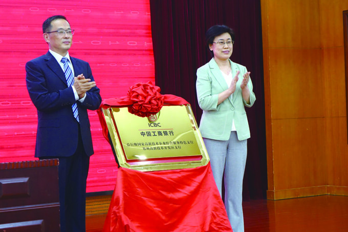 省科技厅党组书记、厅长陈向平(右)与工行河南省分行行长邹平(左)为总行级特色支行郑州高新区支行揭牌。