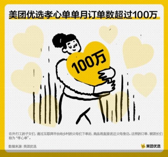 数据显示,美团优选上全国“孝心单”单月订单数已经超过百万,超过三成的孝心单为95后下单。子女们在设置好父母家地址后,可以一键下单给父母家附近的团长,团长在接到“孝心首选”商品订单后,将会进行优先分拣,还将为取货不便的老人提供送货上门服务。