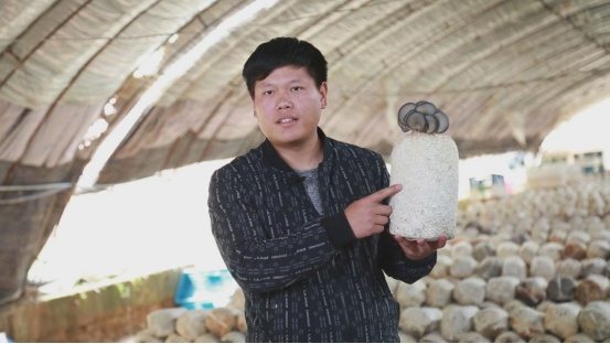 菇农小飞展示他种植的平菇