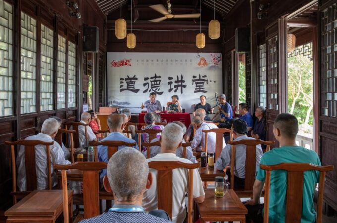 “英勇就义天恸哭,青春热血洒疆场。吴淞江水亦幽咽,苏州吴中区甪直儿女慨而慷。雨花忠魂励后人,前赴后继挺脊梁。不忘初心跟党走,牢记使命向前方!”随着醒木最后一拍,沉浸在故事中热泪盈眶的观众们此时方从情节中清醒过来,随之而来的则是阵阵掌声。这是在江苏省苏州市吴中区甪直镇江南文化园道德讲堂的平常一幕。