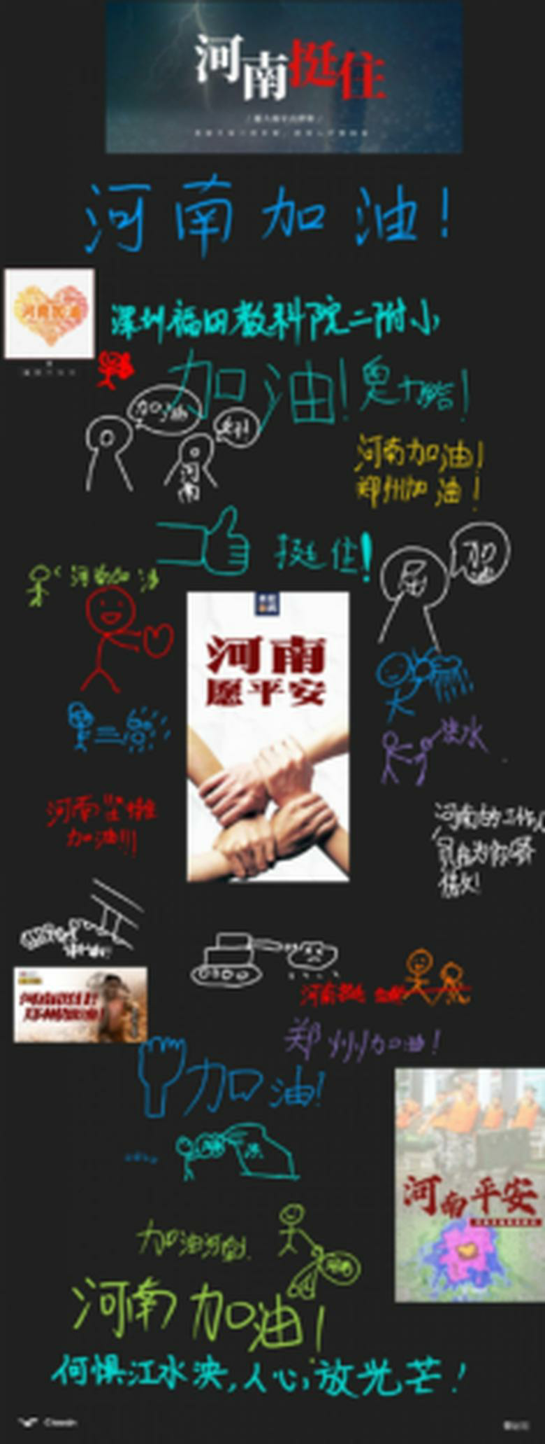 写下什么祝福给河南民众呢?这些深圳学子们纷纷脑洞大开。来自南华小学的王泽楷同学说:“我要画个太阳擦掉河南暴雨”——他用寥寥几笔画出一个小人,小人托举了一个“太阳”,“照射”着雨云;还有同学说,“我要画个坦克,把积雨云都干掉”……还有同学什么都不说,直接写下“河南,奥利给!”还有同学画了寓意着“加油鼓劲”的拳头;而当天参与托管服务的深圳义工志愿者也上前写下了“何惧江水泱,人心放光芒”的诗句。