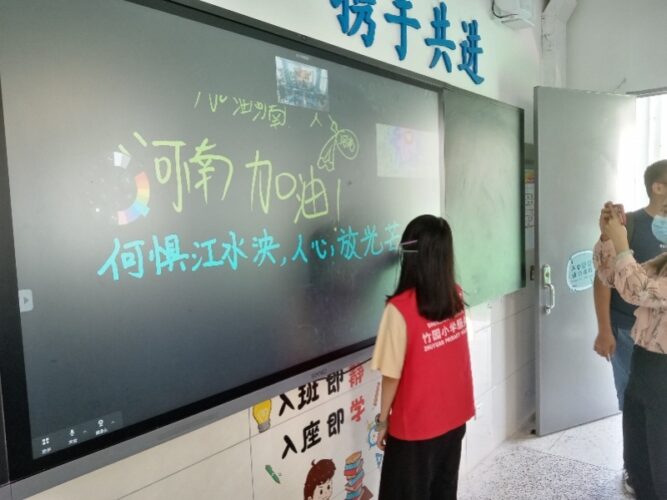 这份祝福不能仅仅留在心里,还要留下笔迹,还要传播出去。于是,在老师的号召下,同学们舞动自己的手指,在ClassIn电子黑板上涂写下自己对河南汛区的祝福。这些“涂鸦”在电子技术和云端技术的加持下,生成了五颜六色的“作品”——对于汛区学子而言,这是来自1300公里外的真挚礼物。