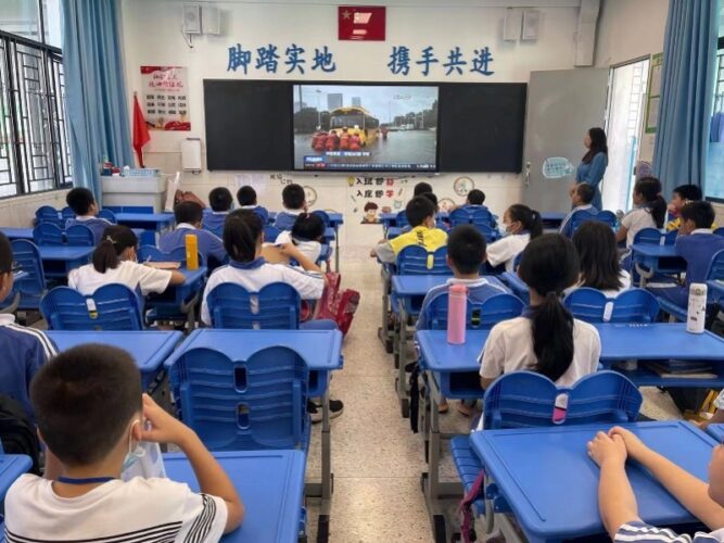 上午9时许,福田区教科院第二附属小学暑托班中,同学们正襟危坐,目光严肃地投向讲台上的大屏幕。屏幕中播放的是河南暴雨的实时讯息画面,镜头中,河南许多城市的路面积水依然较重,同学们目睹这一切,揪心地皱起了眉头。