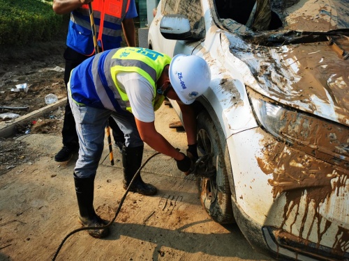 暴雨峰值过后,郑州迅速进入灾后恢复阶段。在得知市区华中阜外医院地下车库存在大量积水以及漏油情况后,中建八局一公司装饰公司中原片区立即组织驻地数字小镇、郑州南站项目成员组成青年志愿突击队,调配叉车等相关设备,前往该医院协助进行道路疏通、积水外排等工作。