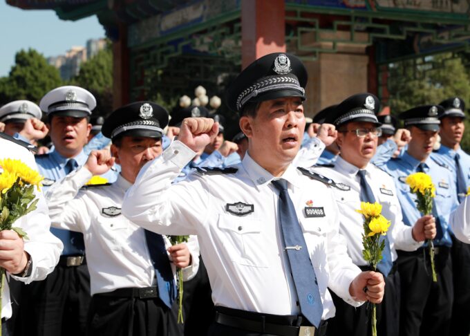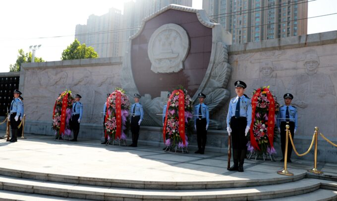 上午10时许,祭奠仪式正式开始。在河南公安英烈纪念墙前,参加祭奠活动的全体人员整齐列队,警容严整,神情肃穆,在庄严的乐曲中集体奏唱中华人民共和国国歌,全体民警脱帽致敬、鞠躬默哀,8名礼兵在深情的《献花曲》中,抬起花篮缓步走向公安英烈纪念墙,向公安英烈敬献花篮,副省长、公安厅长顾雪飞上前仔细整理花篮缎带,随后,全体民警在庄严肃穆的气氛中重温入警誓词,并列队缓步绕行,瞻仰英烈纪念墙,为烈士们敬献鲜花,表达了对公安英烈的深切缅怀。