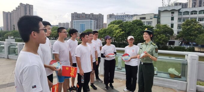 德化县赤水镇人武部部长林亚萍为大学生们解说德化陶瓷和征兵政策
