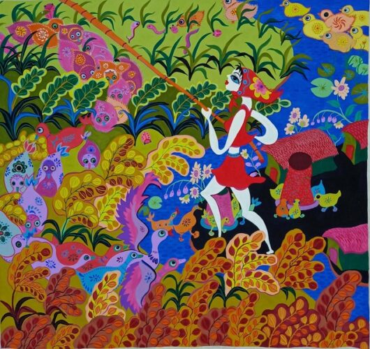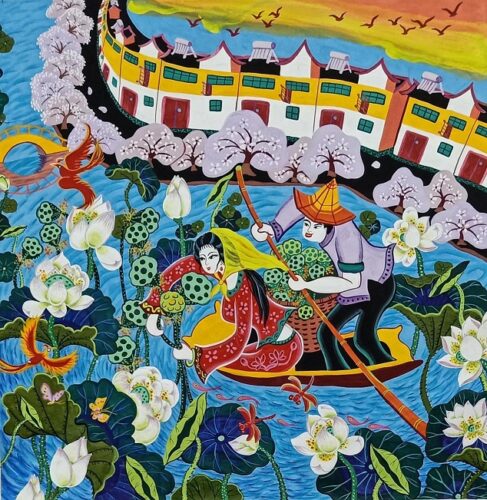 农民画是画天画地画自己。基于对苏北这一方水土的热爱和美好向往,近年来,赵敏巳创作了二三十幅“鱼米之乡”系列作品,风格奇幻、灵动、唯美,民间味强烈。这些创作灵感多来源于她生活的乡村场景。