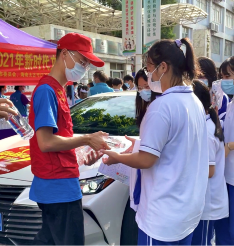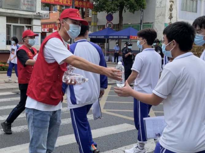 志愿者们为考生递上矿泉水的同时还通过“好好发挥,考试加油,不要紧张,祝你金榜题名”等简单话语为他们加油打气。