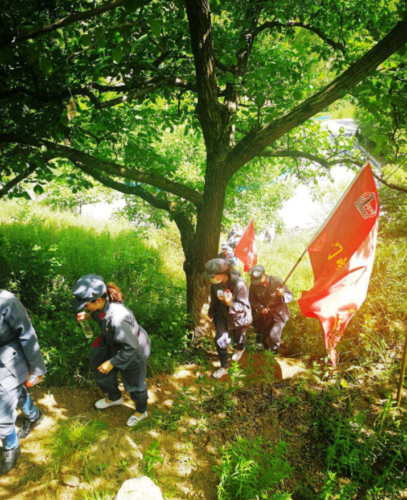 大家冒着近40度的高温,在党旗和中国石化旗帜的指引下,沿着羊肠小道进行攀登,没有一个人叫苦叫累,展示了当代石化共产党员员工顽强不屈、敢打必胜的优良作风。