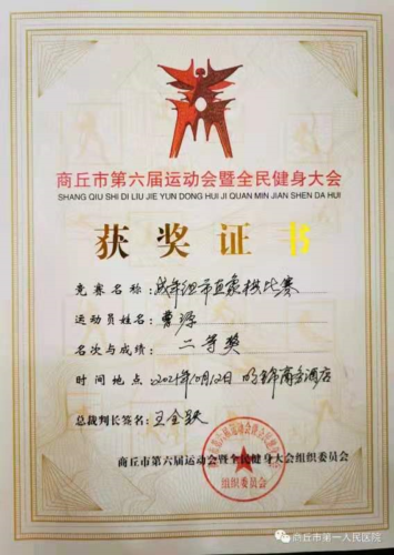 经过2天9轮紧张激烈的对弈、角逐,商丘市第一人民医院荣获团体一等奖,曹源荣获个人二等奖,为医院赢得了荣誉。