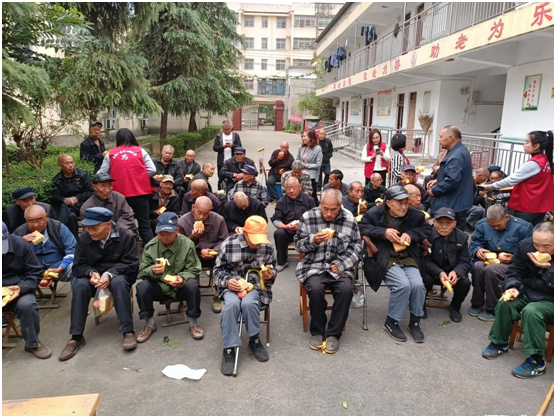 活动中,大伙分工明确,各自有条不紊的做着力所能及的事情,陪老人聊天、帮老人搬轮椅,给老人分发水果、面包等等。