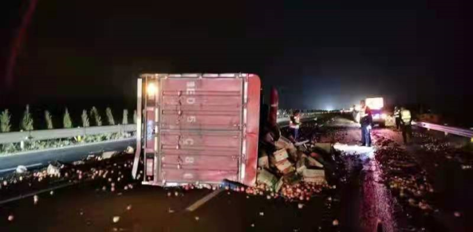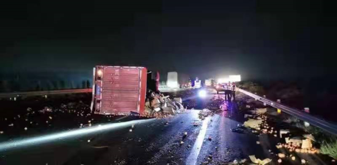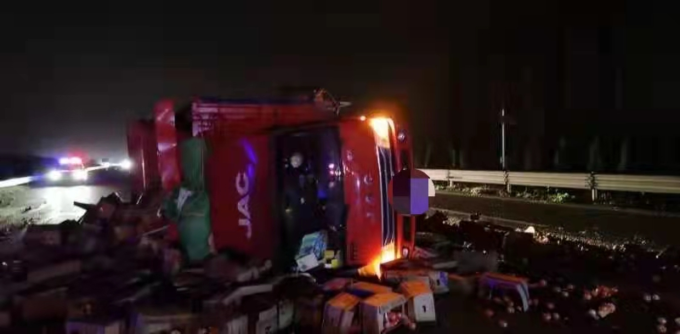 10月18日2时许,深秋季节凌晨的气温已经非常低。在京港澳高速709公里西半幅,一辆蓝牌货车因轮胎爆胎引发了车辆侧翻单方交通事故。