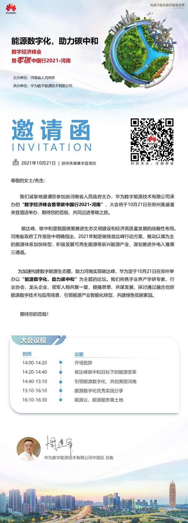 10月21日,零碳中国行2021·河南,郑州美盛喜来登酒店,运用华为数字能源技术优势,助力河南实现碳中和!