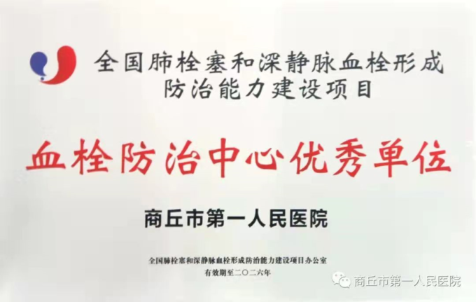 由全国肺栓塞和深静脉血栓防治能力建设项目办公室主办的第三届“2021年中国VTE防治大会”于10月14日至15日在成都举行。会上,商丘市第一人民医院获全国肺栓塞和深静脉血栓形成防治能力建设项目办公室授牌,成为“血栓防治中心优秀单位”。