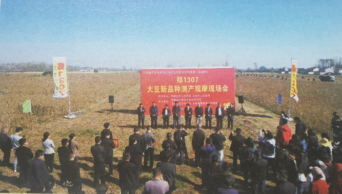 永城市曾是我省大豆种植第一大县,种植面积最大时占全省大豆种植面积的十分之一,是当地的优势作物,正常年份平均亩产150公斤左右。多年来,永城市大豆生产存在着管理粗放、大豆症青现象严重等问题,影响了大豆产量和效益,近两年种植面积有所下降。为了推动当地大豆单产水平提高,提高农户种植大豆的积极性,省农科院大豆团队在院市合作项目的支持下,以高产新品种郑1307为核心,在永城市示范良种良法配套及全程机械化技术。