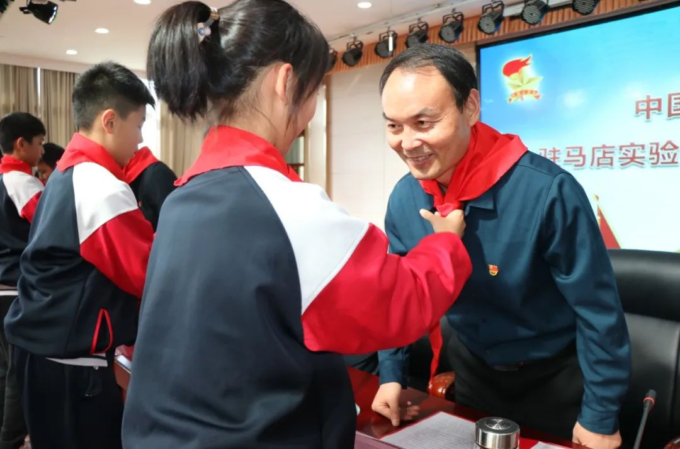 随后,少先队员为学校领导系上鲜艳的红领巾,并行队礼致以崇高的敬意。
