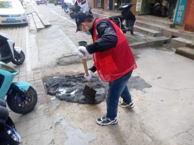 根据辖区居民反映由于路面日久磨损,凹凸不平,每当阴雨天,路面容易积水,严重影响了居民的生活和出行。得知这一情况后,社区工作人员立即到现场查看,发现部分道路破损,凹凸不平,影响了居民的生活和出行。社区立即购买水泥、大沙对其进行修补,同时设置安全保障线提醒居民注意安全。经过社区工作人员的精心修护,路面重新变得平整干净了。