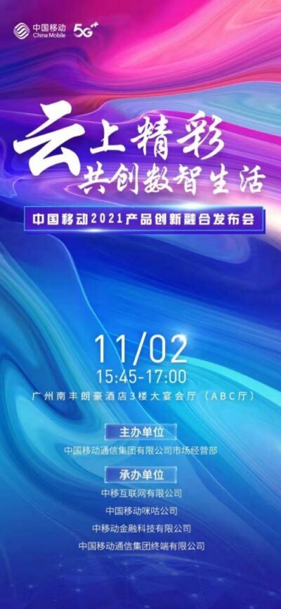11月2日下午,以“云上精彩,共创数智生活”为主题的2021中国移动全球合作伙伴大会产品创新融合发布会将在广州南丰朗豪酒店盛大召开。届时,中国移动通信集团有限公司领导、中国移动相关省公司及专业公司领导以及上下游产业链重量级合作企业嘉宾将出席本次发布会,生态化展现5G+数智化前沿科技成果,围绕5G+数智化最新产品、5G应用技术、解决方案、应用场景等热点话题进行深度探讨,共绘5G数智生活新蓝图。