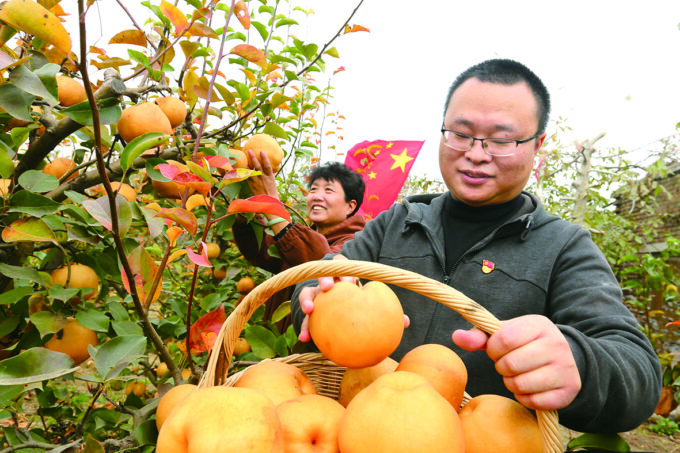 10月31日,安阳市滑县王庄镇龙村,滑县交通运输局派驻该村第一书记、党员志愿者魏亚(前)和该村党支部委员龙金红正在帮助林果种植户杨会选采摘晚秋黄梨。