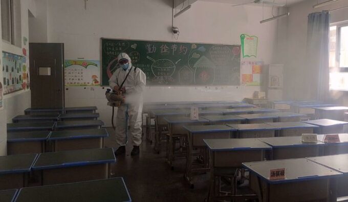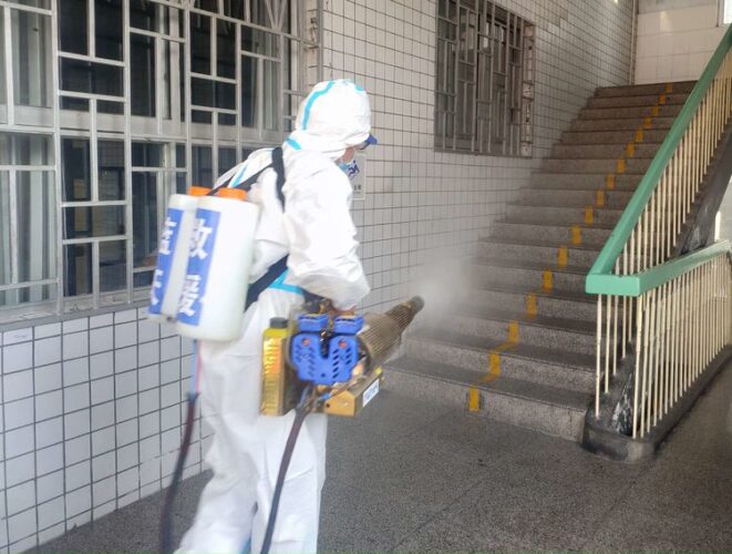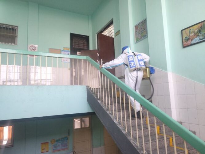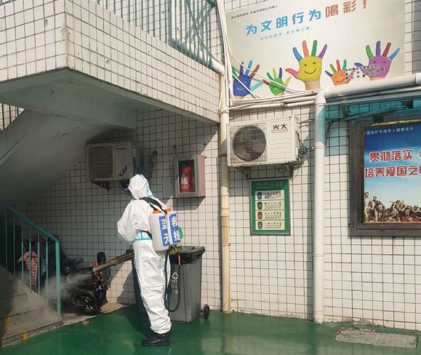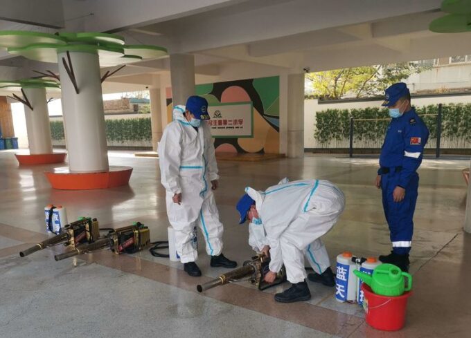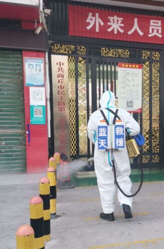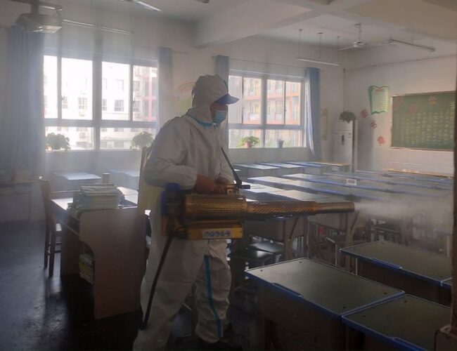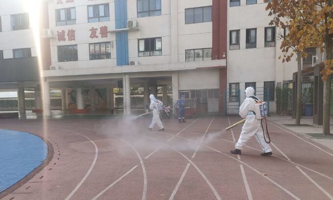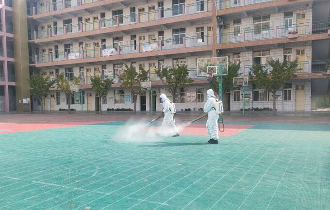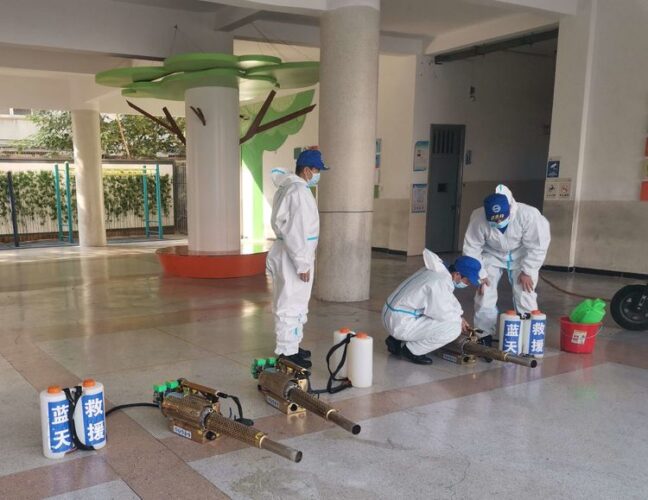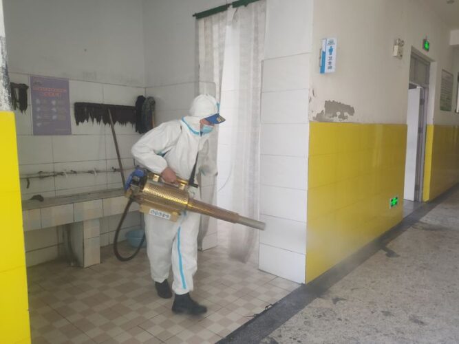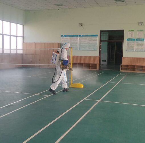 消毒过程中,蓝天救援队的工作人员严格按照消毒要求,认真配好消毒液,背上专用喷雾器,对学校的每一间教室、办公室、功能室以及校园操场、厕所、走廊、文化长廊等师生聚集场所进行了科学消毒。工作人员消毒认真、仔细,做到了不留死角、不留盲区,全方位覆盖,进一步净化了校园环境,实实在在为全校师生的安全保驾护航。