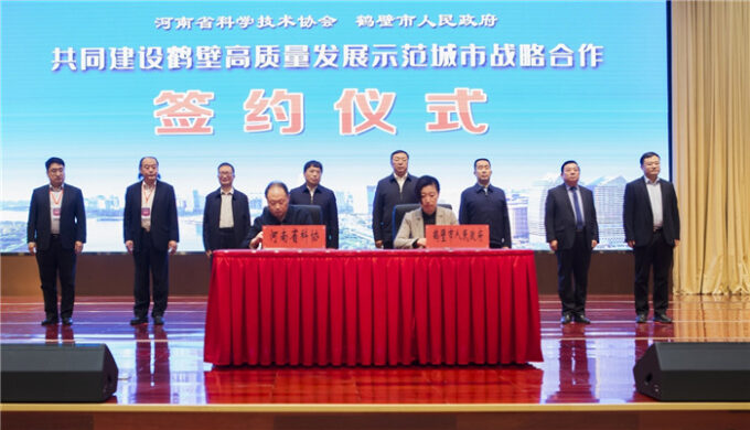 王新会代表中国科协向鹤壁市授“科创中国”试点城市牌。邓洪军、李小莉分别代表省科协及鹤壁市签订共同建设鹤壁高质量发展示范城市战略合作协议。