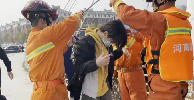 河南商丘:惊险!14岁少年跳河轻生 消防员飞扑救人