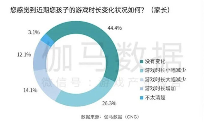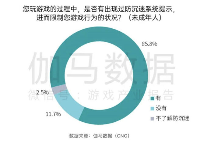 针对《通知》落地后的实际成果,中国游戏产业研究院的战略合作伙伴伽马数据投放数千份问卷、向多个家庭展开了数据调研,11月5日发布《中国游戏产业未成年人保护进展报告》(以下简称《报告》)。《报告》显示,《通知》落地后,有四成家长显著感知孩子游戏时间变短,85.8%的未成年人在玩游戏过程中曾被防沉迷限制。这说明相关措施对于解决家长困扰产生了较积极的推动作用,对未成年人游戏时长做到有效管控。
